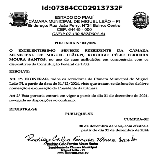 A Câmara Municipal de Miguel Leão, localizada no estado do Piauí, publicou a Portaria Nº 008/2024, assinada pelo Excelentíssimo Senhor Presidente Rodrigo Célio Ferreira Moura Santos. A decisão determina a exoneração de todos os servidores da Câmara a partir do dia 31 de dezembro de 2024, considerando que os cargos são de livre nomeação e exoneração.