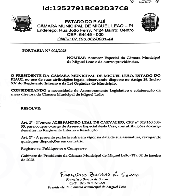 A Portaria nº 002/2025 entra em vigor na data de sua assinatura, revogando quaisquer disposições em contrário. A Câmara Municipal de Miguel Leão segue empenhada em trabalhar pelo desenvolvimento da cidade e pelo bem-estar de seus cidadãos.