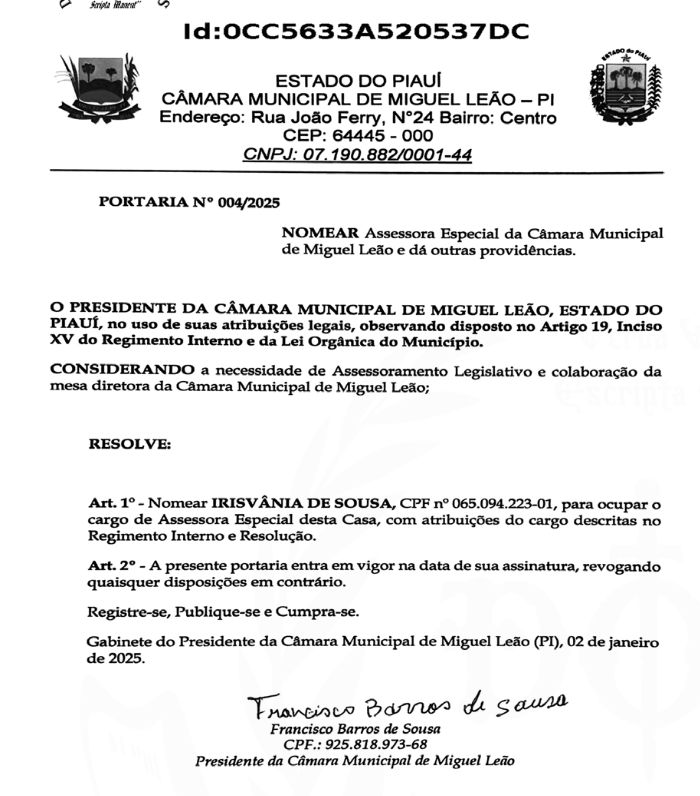 Gabinete do Presidente da Câmara Municipal de Miguel Leão (PI), 02 de janeiro de 2025.